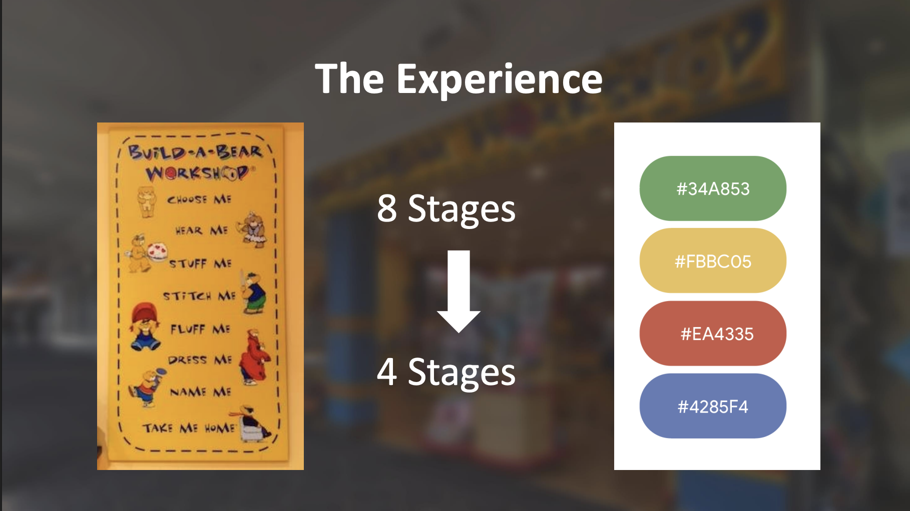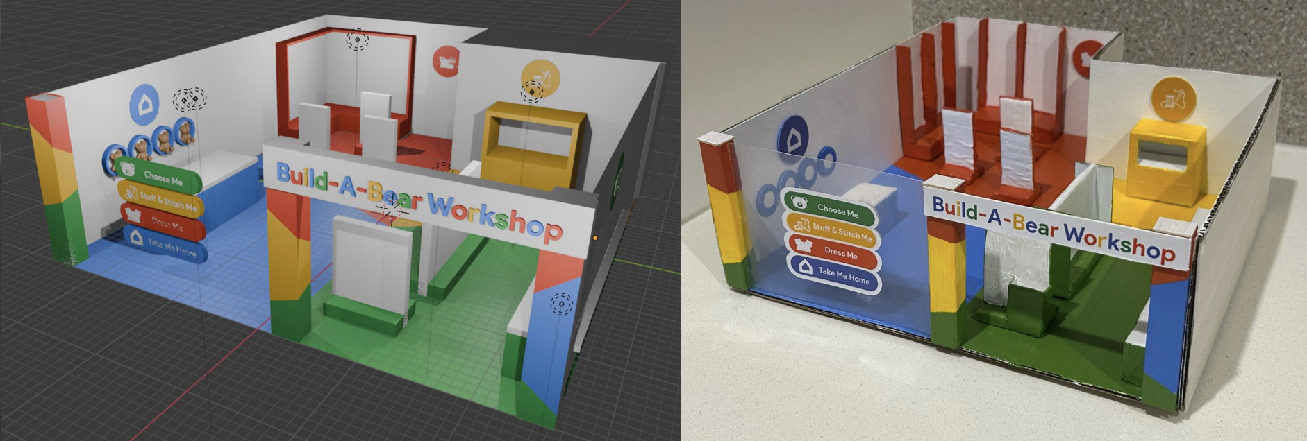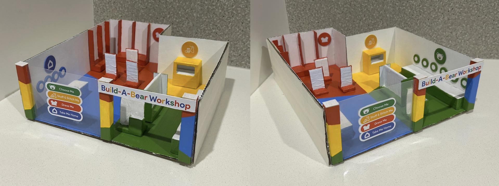 I chose the retail space of Build-A-Bear Workshop in Westfield Belconnen, and rebranded the space under Google’s aesthetic, complete with iconography, colour palette, and typography. By integrating Google’s minimalistic aesthetic and Build-A-Bear’s interactive customer experience, the solution created an intuitive system that not only reflects Google’s branding, but also helps users in orientation as they move through the bear-making process. Key features include a simplified colour-coded system utilising Google’s palette, a custom set of icons for the stages, and a balance between digital and physical elements to guide users effectively.